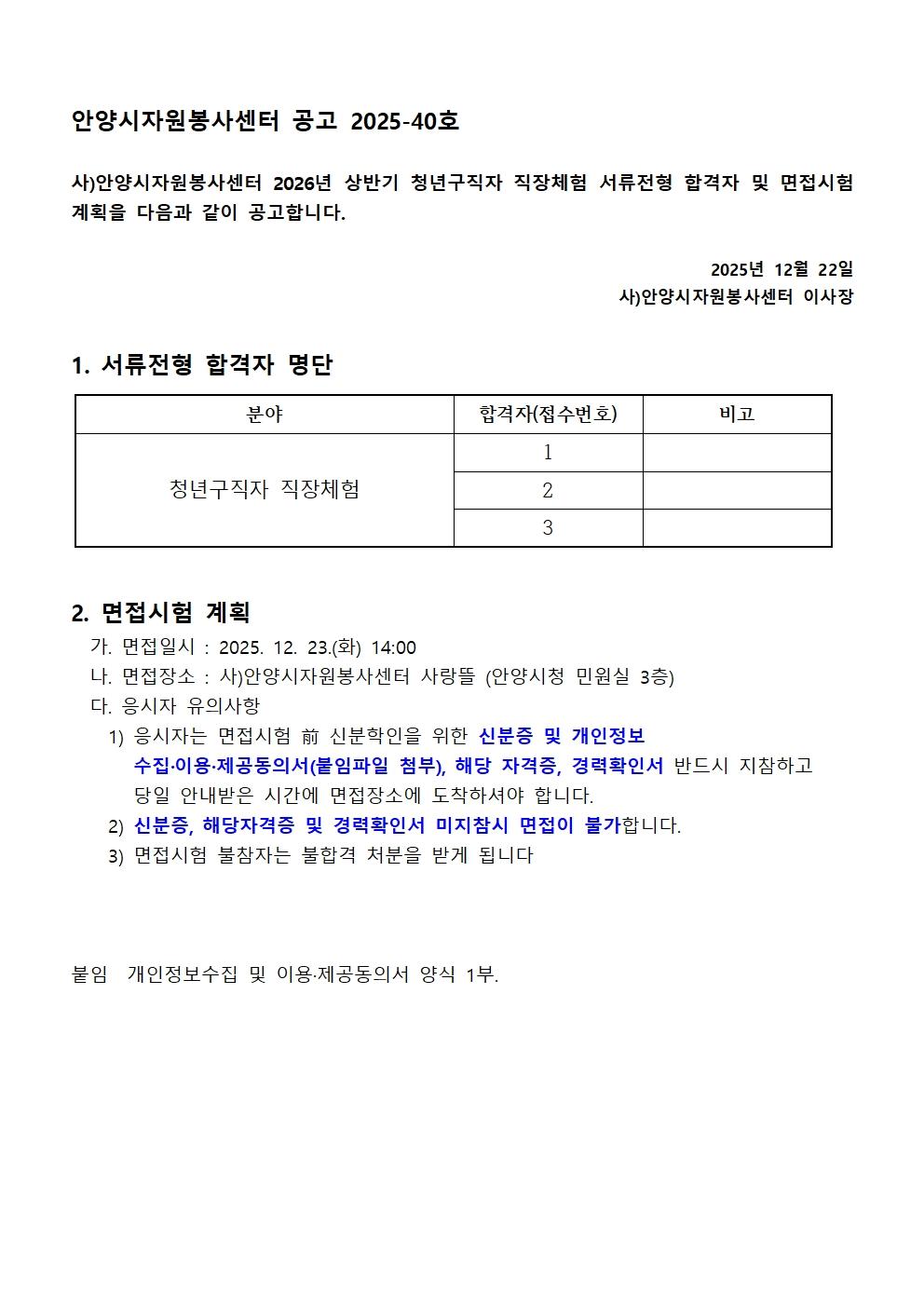 2026년 상반기 청년구직자 직장체험 서류전형합격자 공고