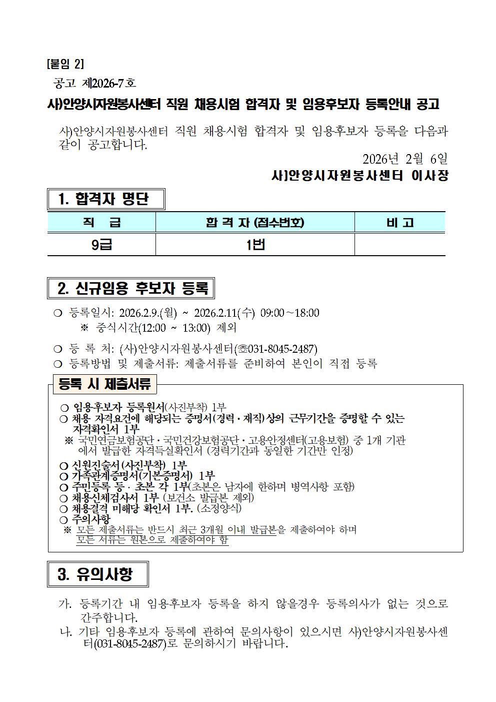 사)안양시자원봉사센터 9급 직원 채용시험 합격자 및 임용후보자 등록안내 공고