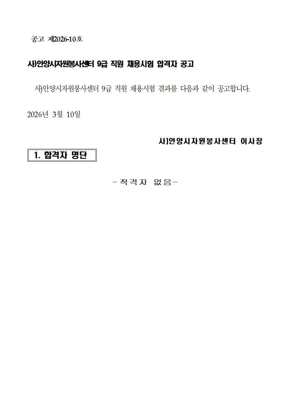 사)안양시자원봉사센터 9급 직원 채용시험(결원충원) 합격자 공고