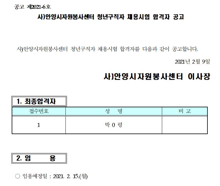 2021년 상반기 청년구직자 면접심사 합격자 공고