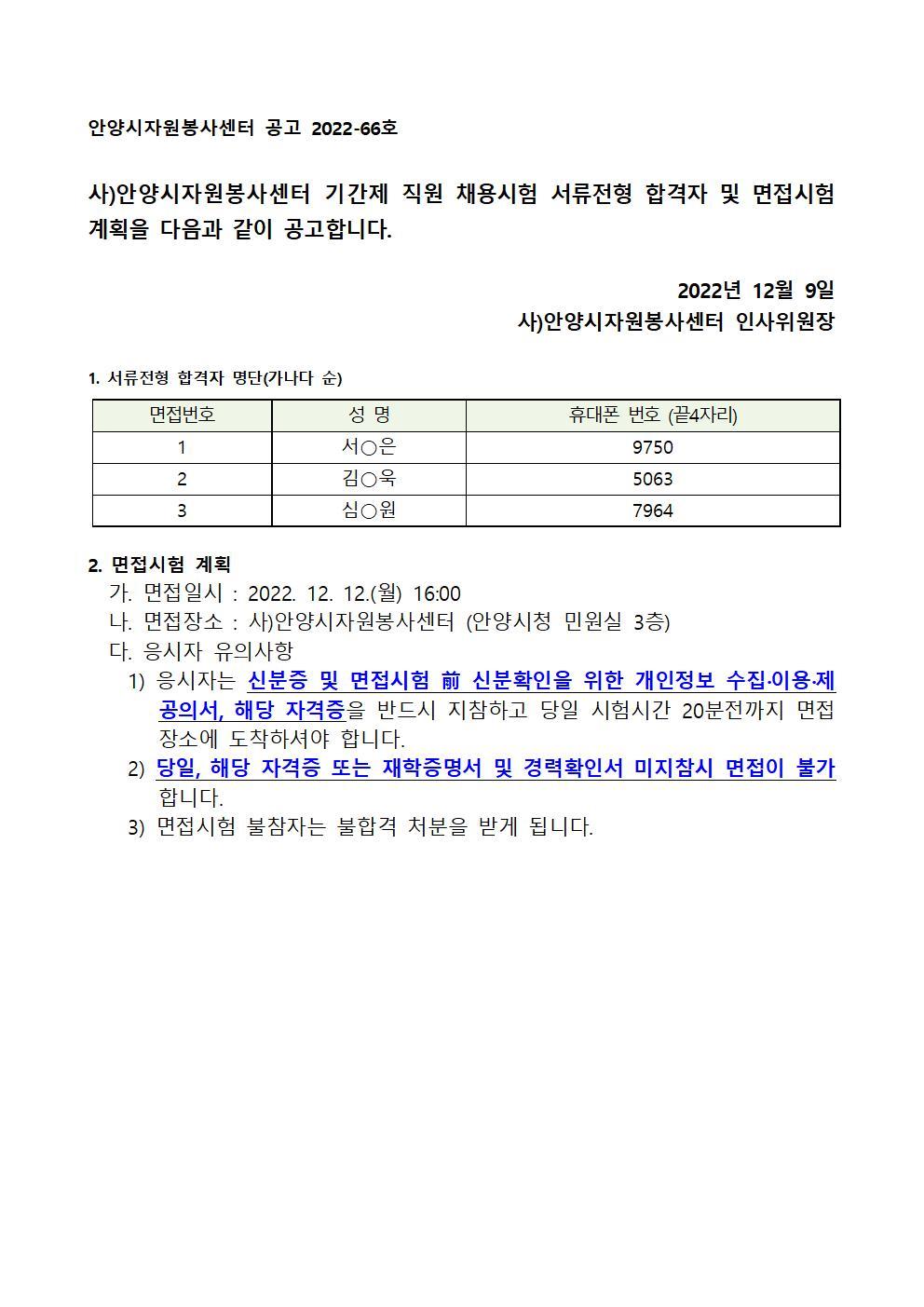 공동모금회 전담인력(기간제 직원) 서류전형합격자 및 면접시험 계획 공고