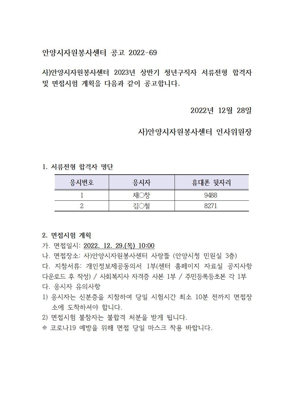 2023 상반기 청년구직자 직장체험 서류전형합격자 공고 및 면접일정 안내