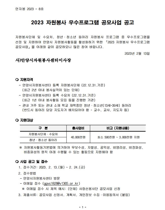 2023년 사)안양시자원봉사센터 직원(9급. 정규직)채용 서류전형합격자 공고