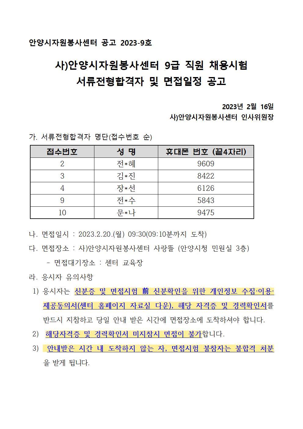 2023년 사)안양시자원봉사센터 직원(9급. 정규직)채용 서류전형합격자 공고