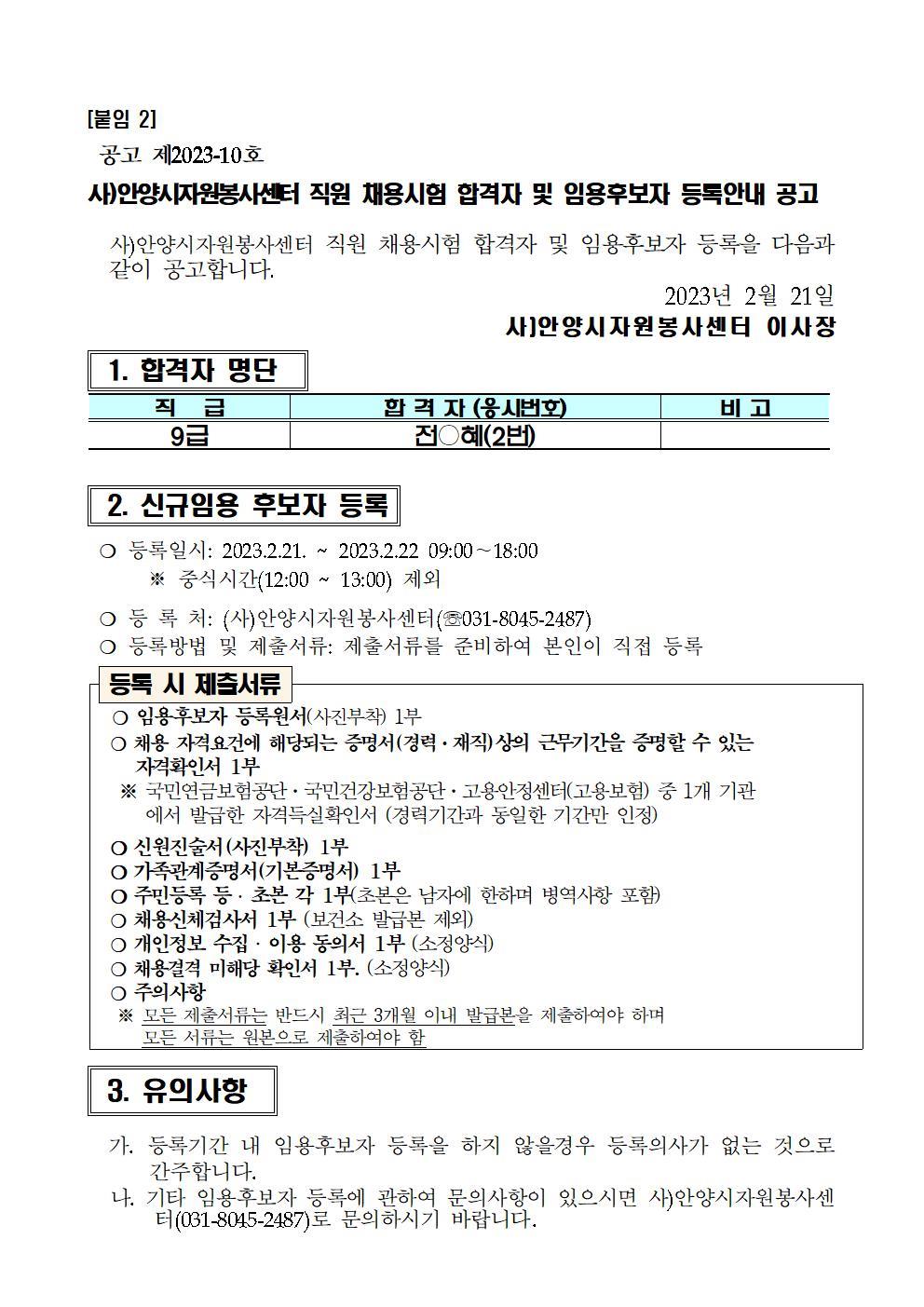[공고] 9급 직원 채용시험 합격자 및 임용후보자 등록 안내