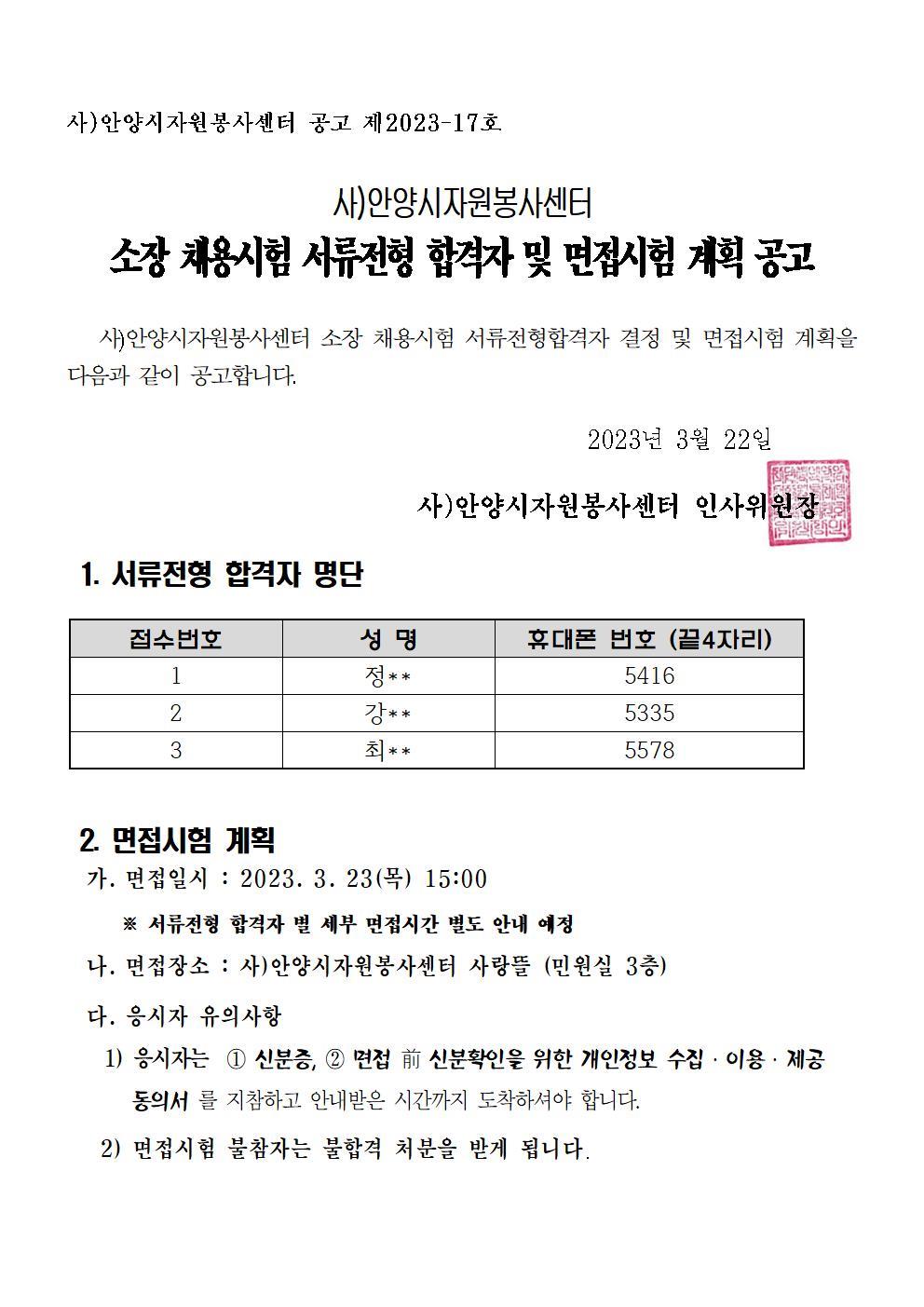 사)안양시자원봉사센터 소장 채용시험 서류전형 합격자 및 면접시험 계획 공고