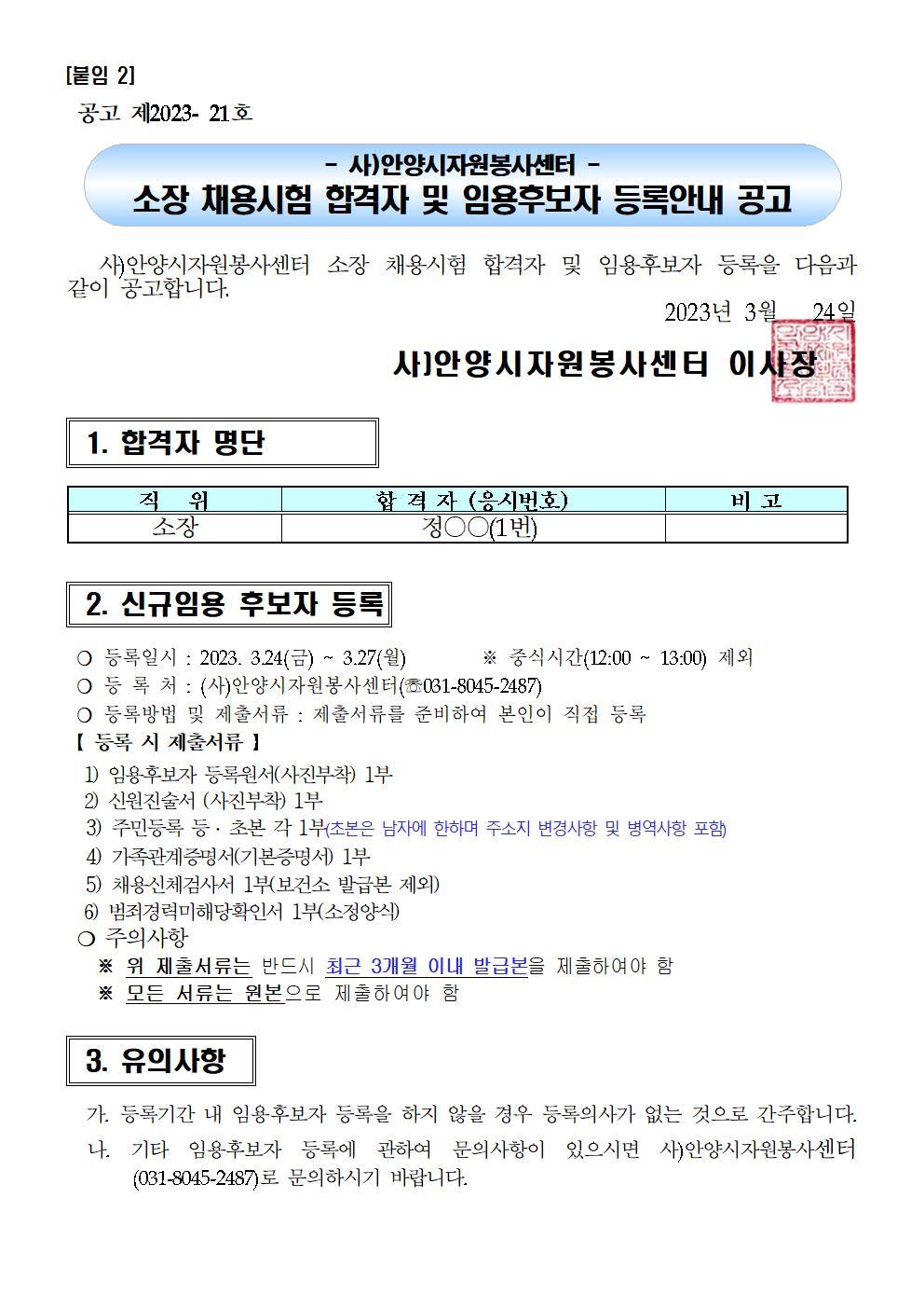 사)안양시자원봉사센터 소장 채용시험 합격자 및 임용후보자 등록안내 공고