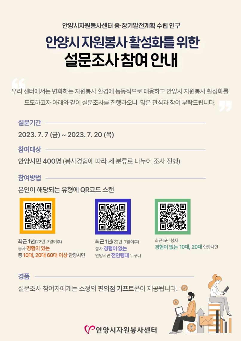 안양시자원봉사센터에서는 변화하는 자원봉사 환경에 능동적으로 대응하고 안양시 자원봉사 활성화를 도모하고자 안양시민 분들을 대상으로 설문조사를 진행하고자 합니다. 이번 설문조사 결과를 바탕으로 안양시자원봉사센터 중장기발전계획을 수립할 예정입니다. 또한 설문조사 참여자분들에게는 소정의 편의점 기프티콘이 제공될 예정이오니 많은 참여와 관심 부탁드립니다.