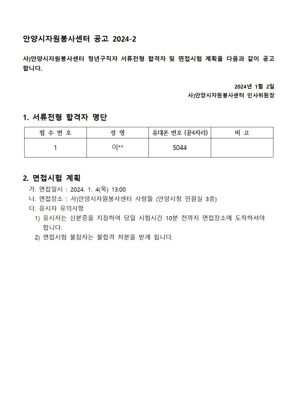 사)안양시자원봉사센터 기간제 직원(외부공모사업 전담인력) 채용 서류전형합격자 공고