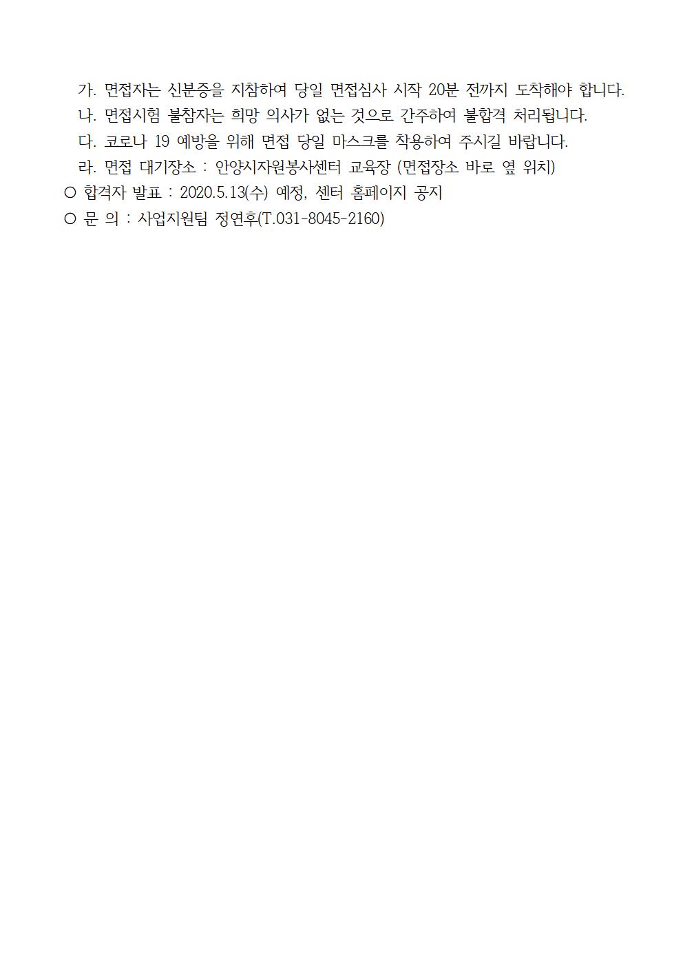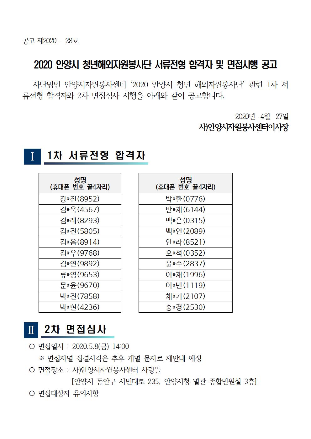 2020 안양시 청년 해외봉사단 서류전형 합격자 및 2차면접심사 시행 공고