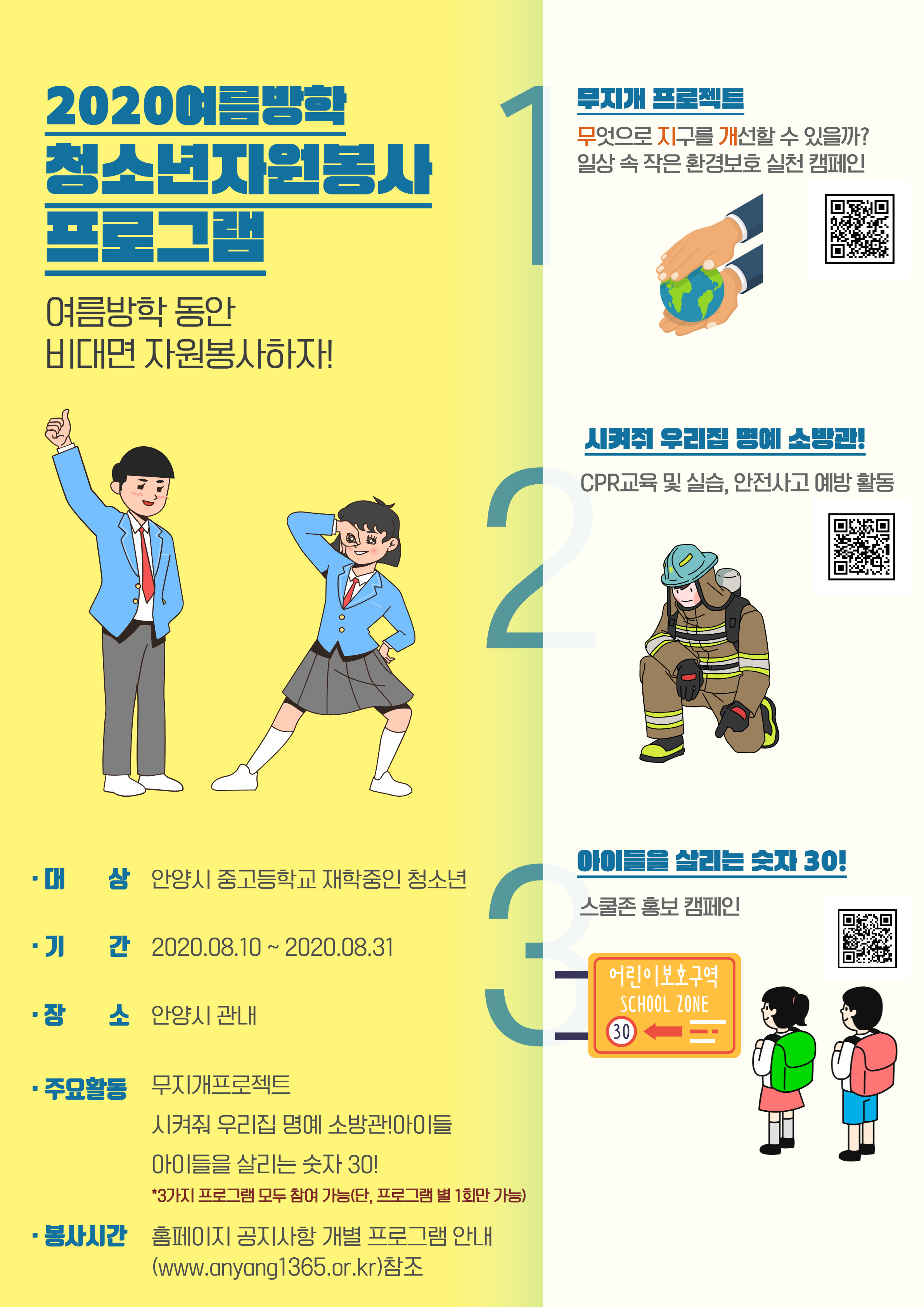 여름방학을 맞아 안양시자원봉사센터에서는 청소년분들을 대상으로 봉사프로그램을 진행합니다. 이번 방학은 코로나19확산 방지를 위해 무지개 프로젝트 등 3가지 비대면 자원봉사 프로그램들으로 진행됩니다. 포스터내의 QR코드를 입력하시면 개별 프로그램 안내 페이지로 넘어갑니다. 안양시 청소년 여러분들의 많은 참여와 관심 부탁드립니다.