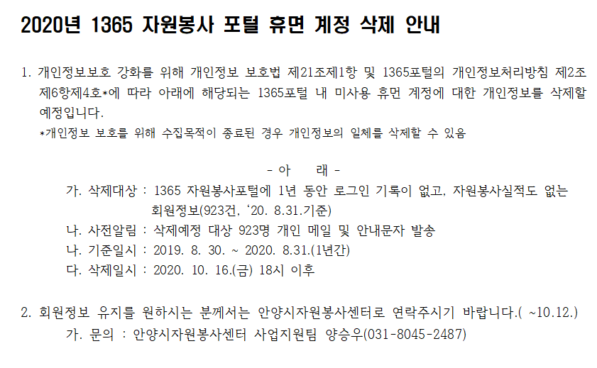2020년 1365 자원봉사 포털 휴면 계정 삭제 안내