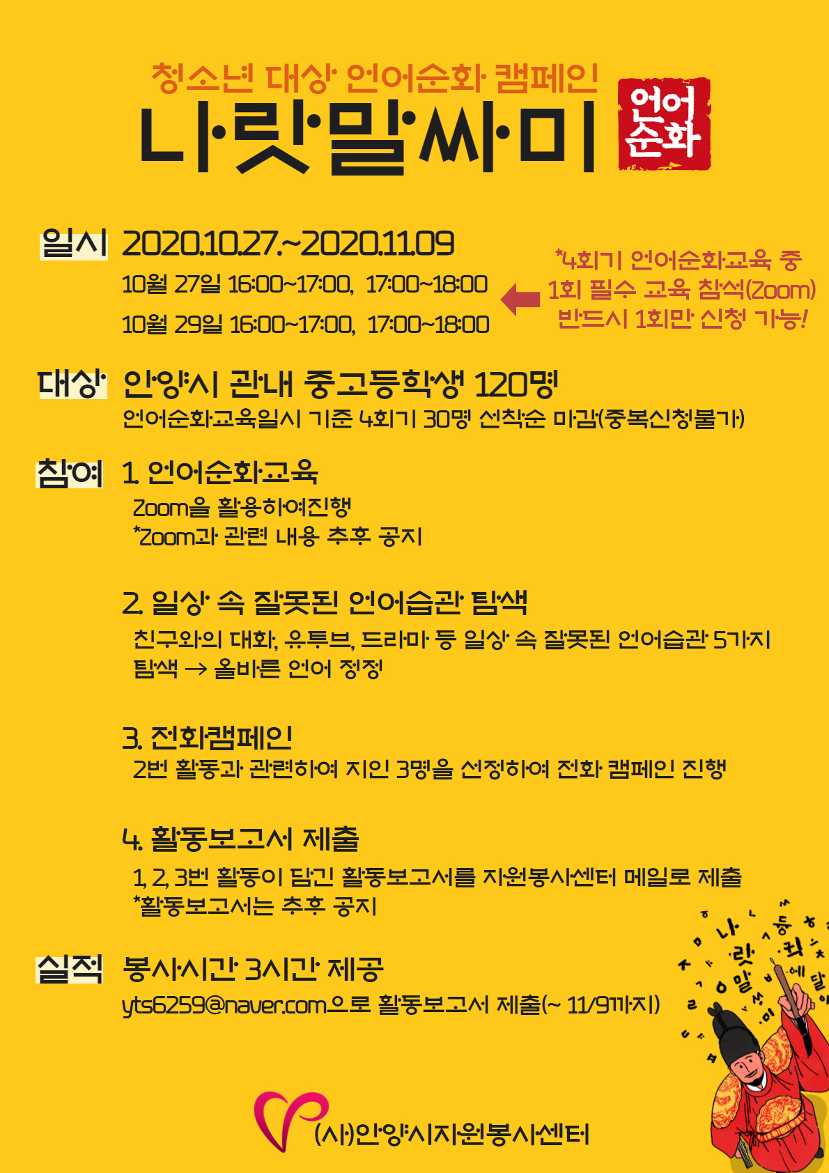* 문의사항 : 안양시자원봉사센터 사업지원팀 양승우(031-8045-2487)