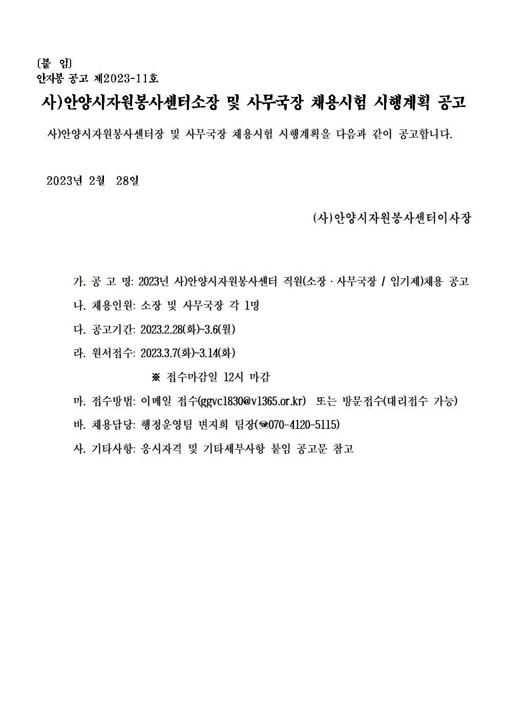 [채용공고] 사)안양시자원봉사센터 소장 및 사무국장 채용공고