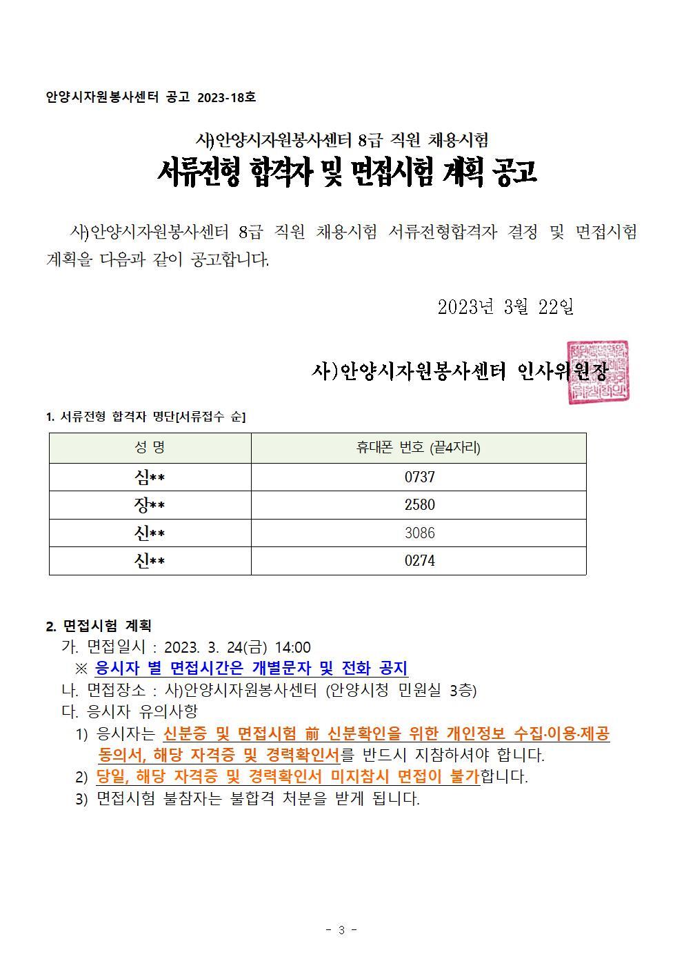 사)안양시자원봉사센터 소장 채용시험 서류전형 합격자 및 면접시험 계획 공고