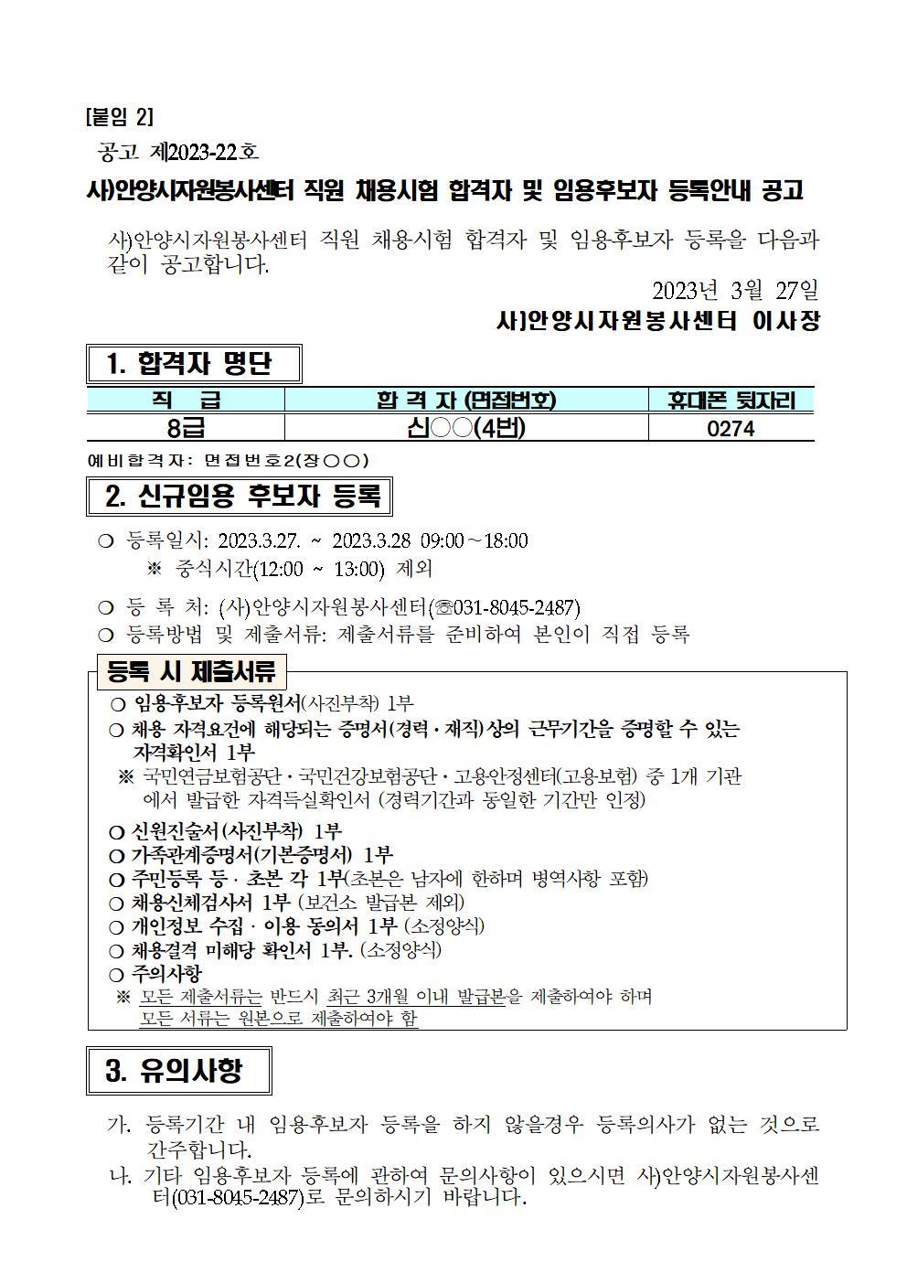 사)안양시자원봉사센터 소장 채용시험 합격자 및 임용후보자 등록안내 공고