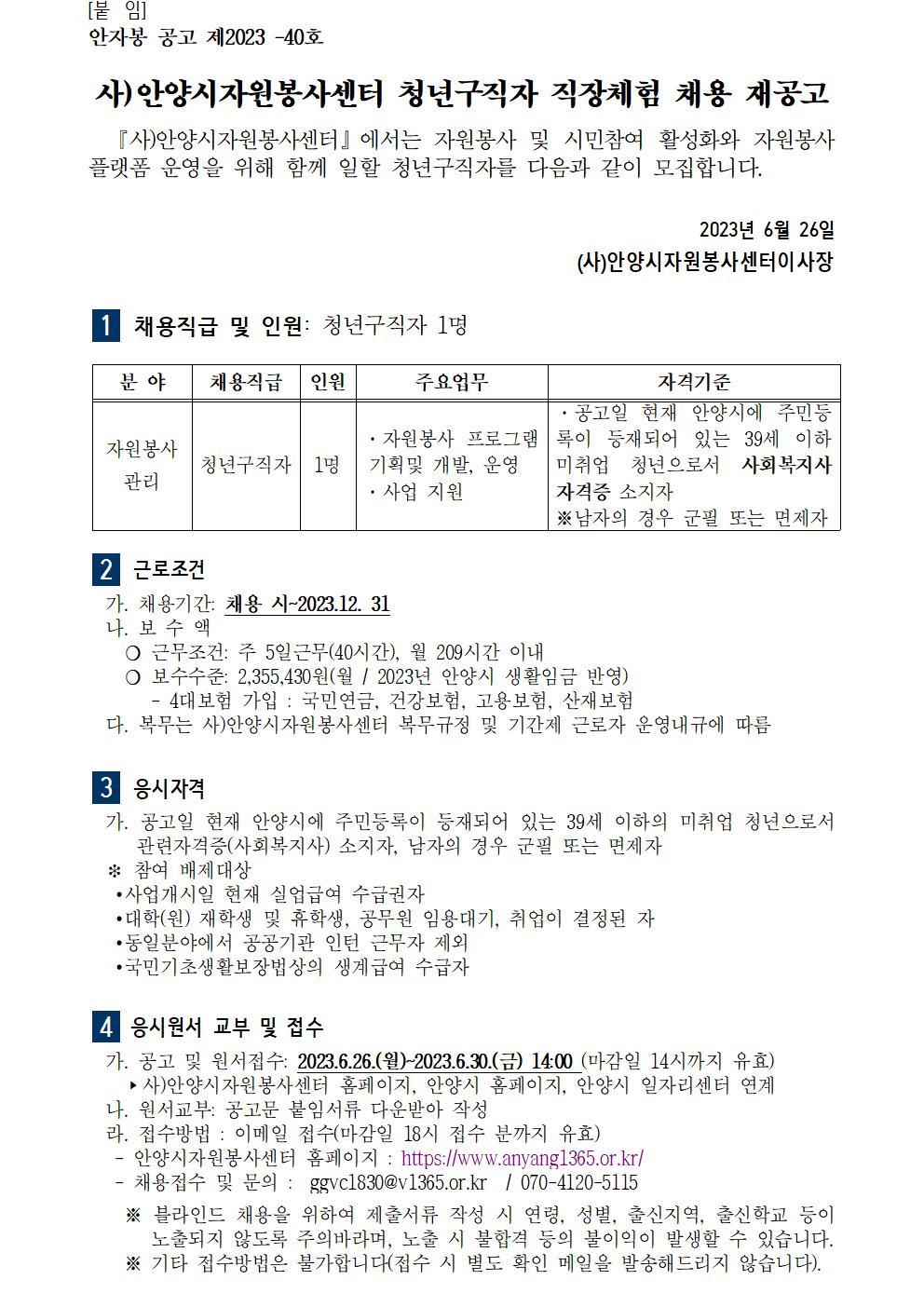 사)안양시자원봉사센터 청년구직자 직장체험 채용 재공고
