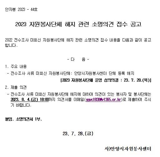 2023 자원봉사단체 해지 관련 소명의견 접수 공고