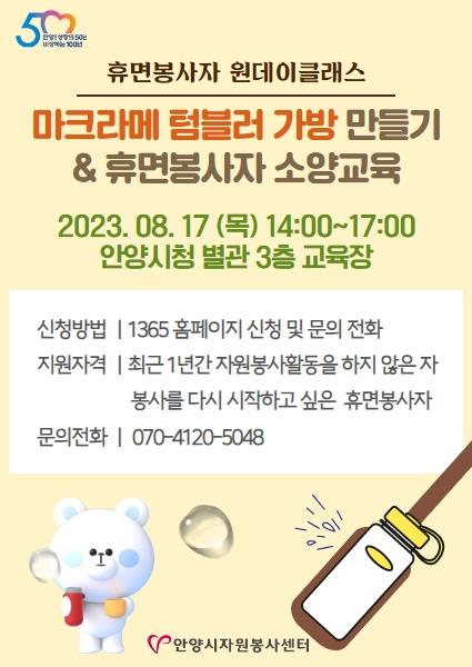휴면봉사자 원데이클래스 - 마크라메 텀블러 가방 만들기 - 활동일시: 2023.08.17.(목) 14:00~17:00 - 활동내용: 자원봉사 소양교육 및 마크라메 텀블러 가방 만들기 봉사시간 1시간 인정(가방을 만드신 후 직접 가져가기 때문에 1시간 인정됩니다.) - 신청대상: 안양시자원봉사센터 소속 성인봉사자 20명(선착순 마감) 다시 봉사활동 하고싶은, 1년간 (2022.7.1. ~ 2023.07.30.) 봉사활동이 없는 봉사자 (**기존 원데이클래스 참여자 및 불참자는 신청 반려됩니다) - 준비물: 없음. 재료비 무료 - 장소: 안양시 자원봉사센터 교육장 / 안양시청 별관(여권민원실) 3층 - 문의: 070-4120-5048 - 신청: https://www.1365.go.kr/vols/1572247904127/partcptn/timeCptn.do?type=show&progrmRegistNo=3017033 ★ 많은 신청과 홍보 부탁드립니다★ ★신청 후 불참 시 다음 신청에 반려됩니다★