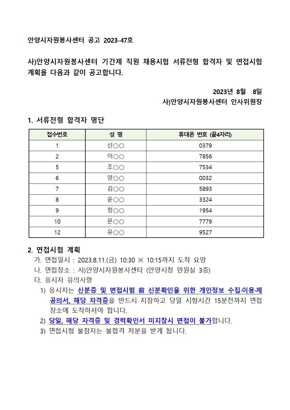 사)안양시자원봉사센터 기간제 직원 채용 서류전형합격자 공고