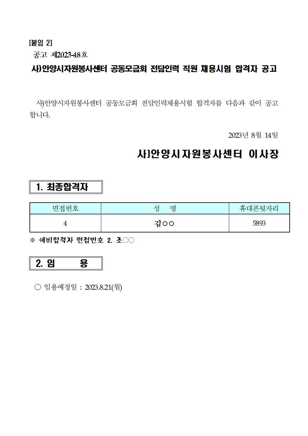 사)안양시자원봉사센터 공동모금회 전담인력 직원 채용시험 합격자 공고