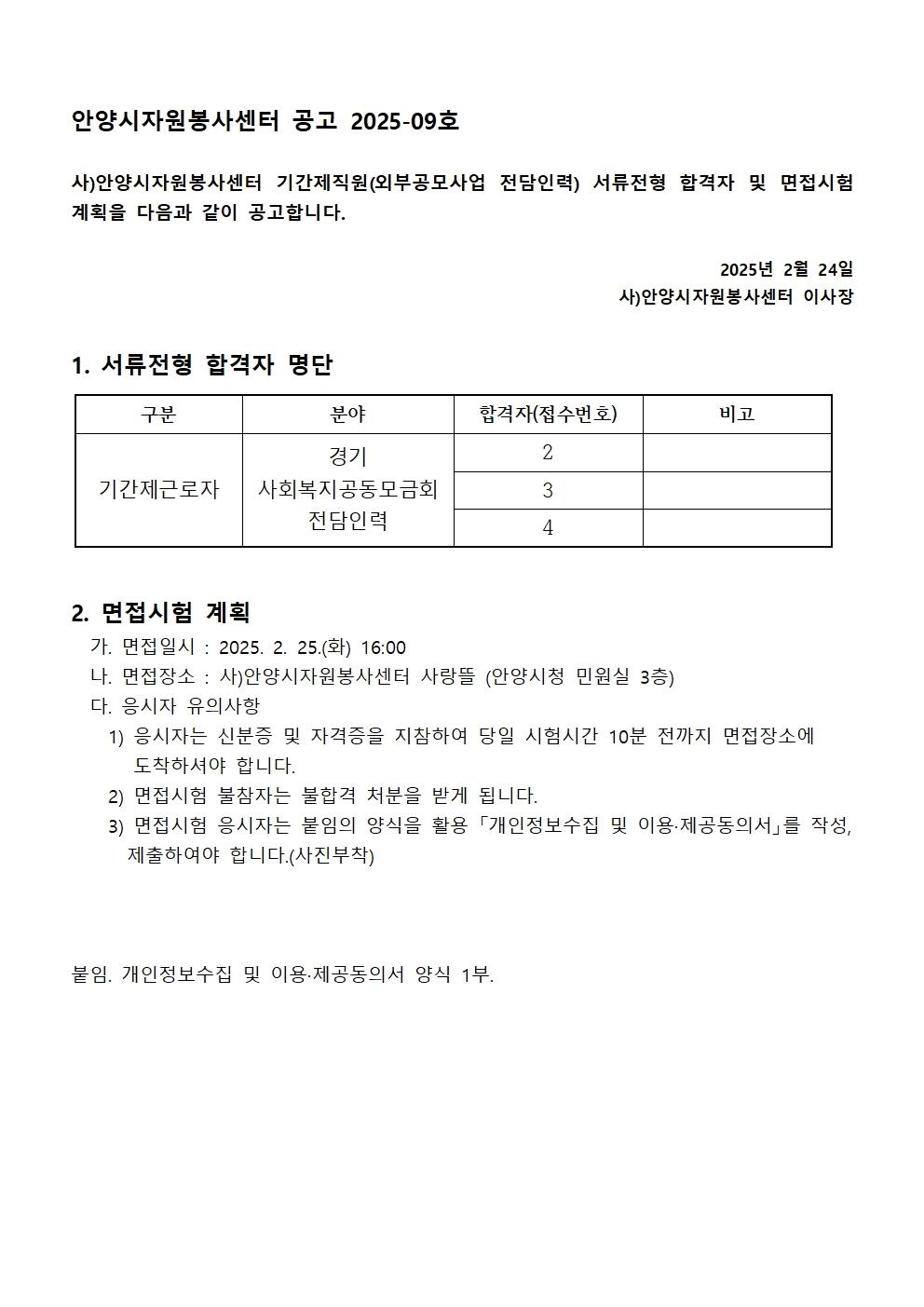사)안양시자원봉사센터 기간제직원 채용 서류전형 합격자 공고