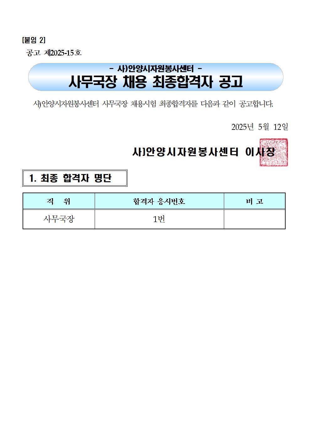 사)안양시자원봉사센터 사무국장 채용 최종합격자 공고