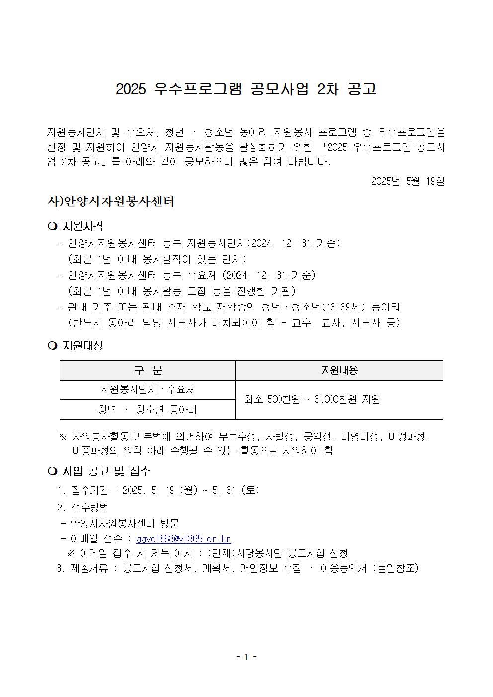 2025 자원봉사 우수프로그램 공모사업 2차 모집