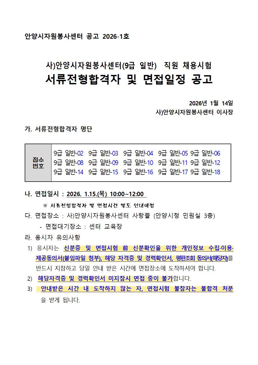 9급(일반)채용 서류전형합격자 공고