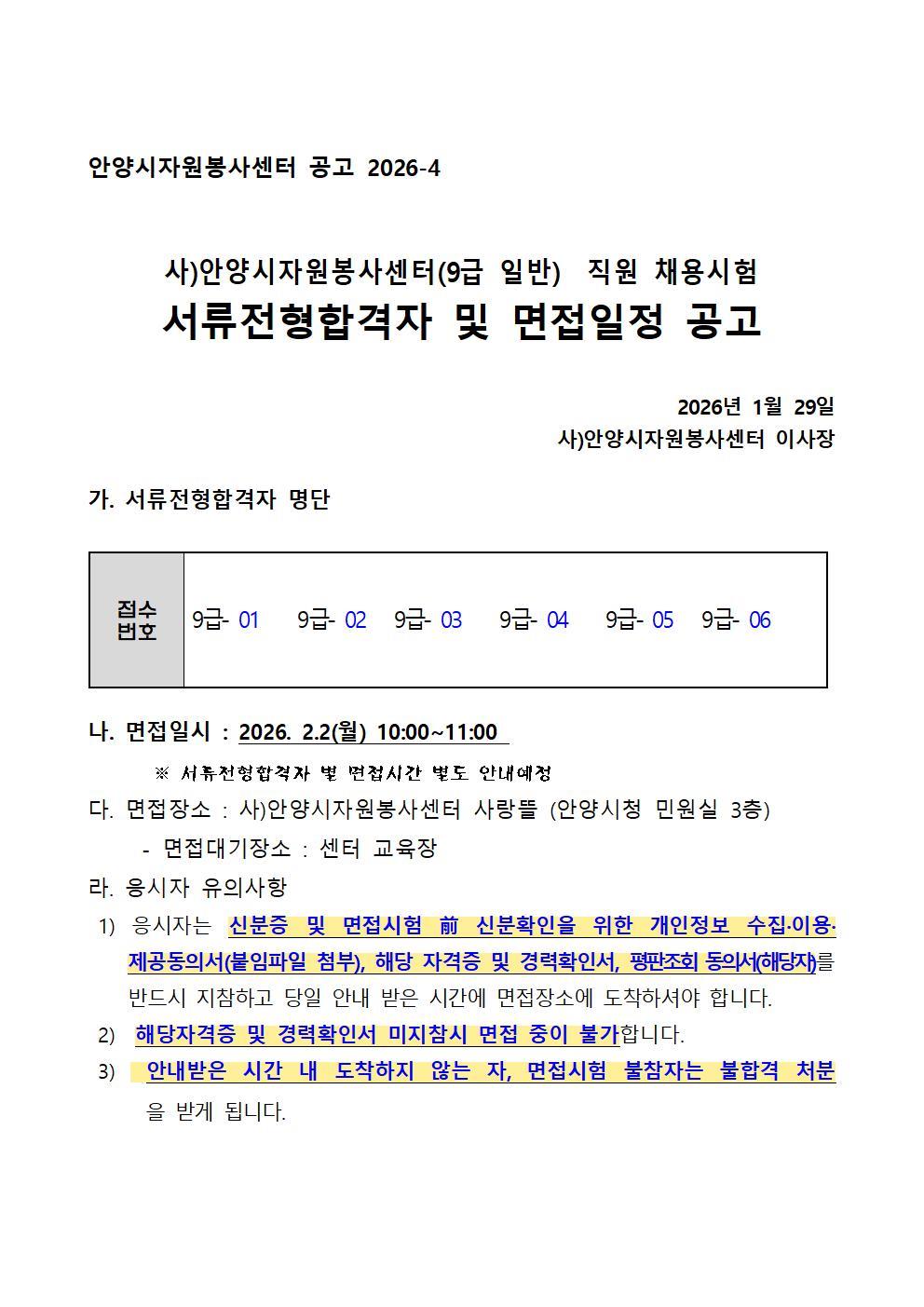 사)안양시자원봉사센터(9급 일반) 직원 채용시험 서류전형합격자 및 면접일정 공고