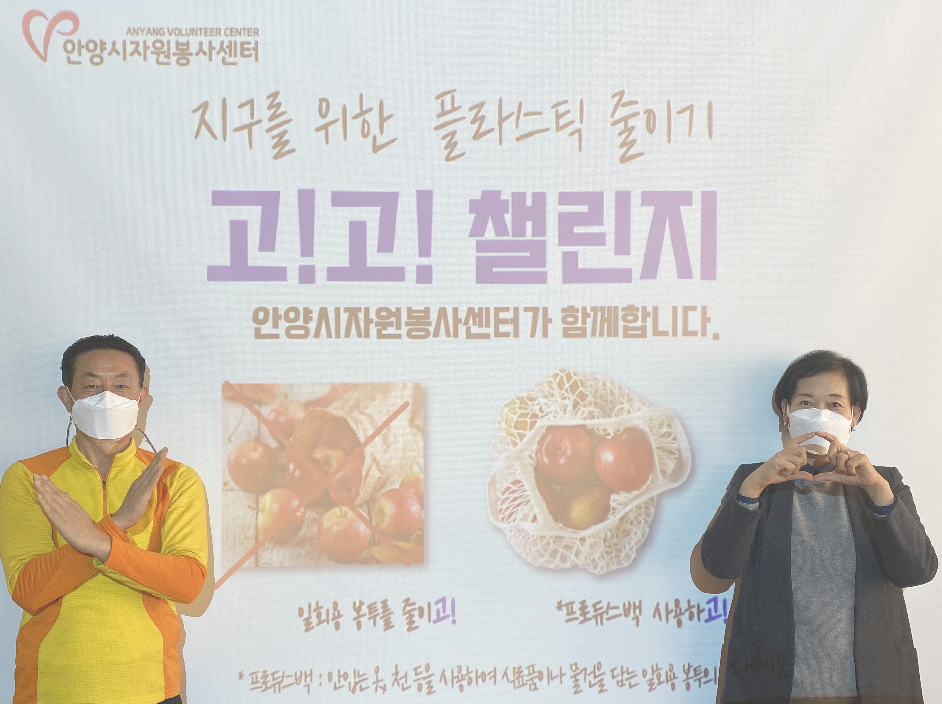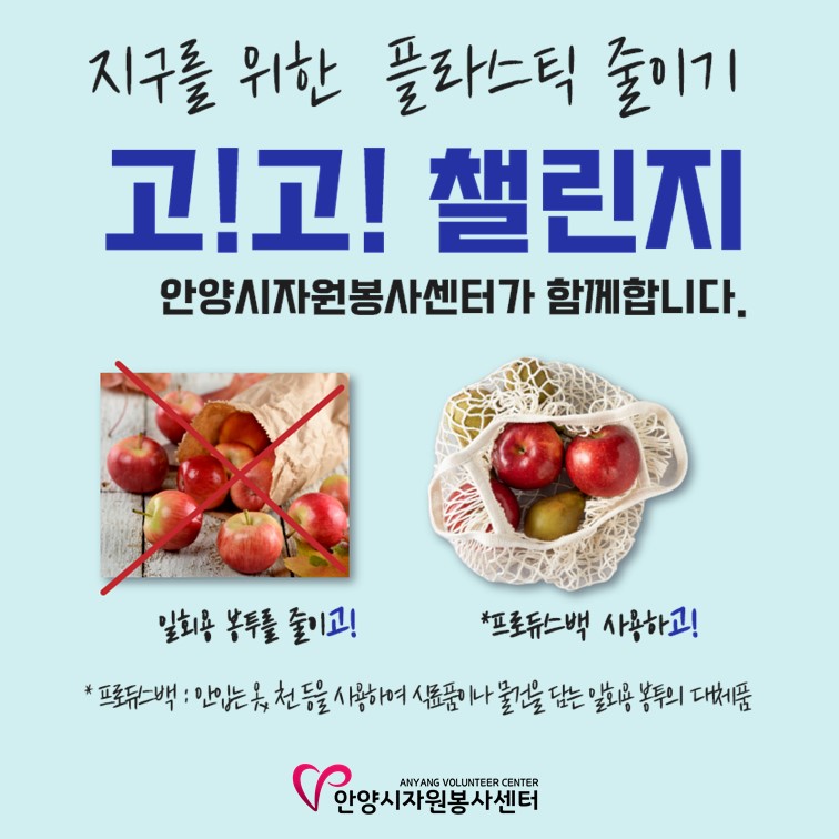 + 안양시자원봉사센터는 일상 속 친환경 캠페인에 동참하고자 이번 챌린지 판넬을 별도 제작하지 않았습니다. 2021년 새롭게 실시되는 안양시 친환경 캠페인 "안양씨의 사칙연산"도 많은 관심 부탁드립니다.