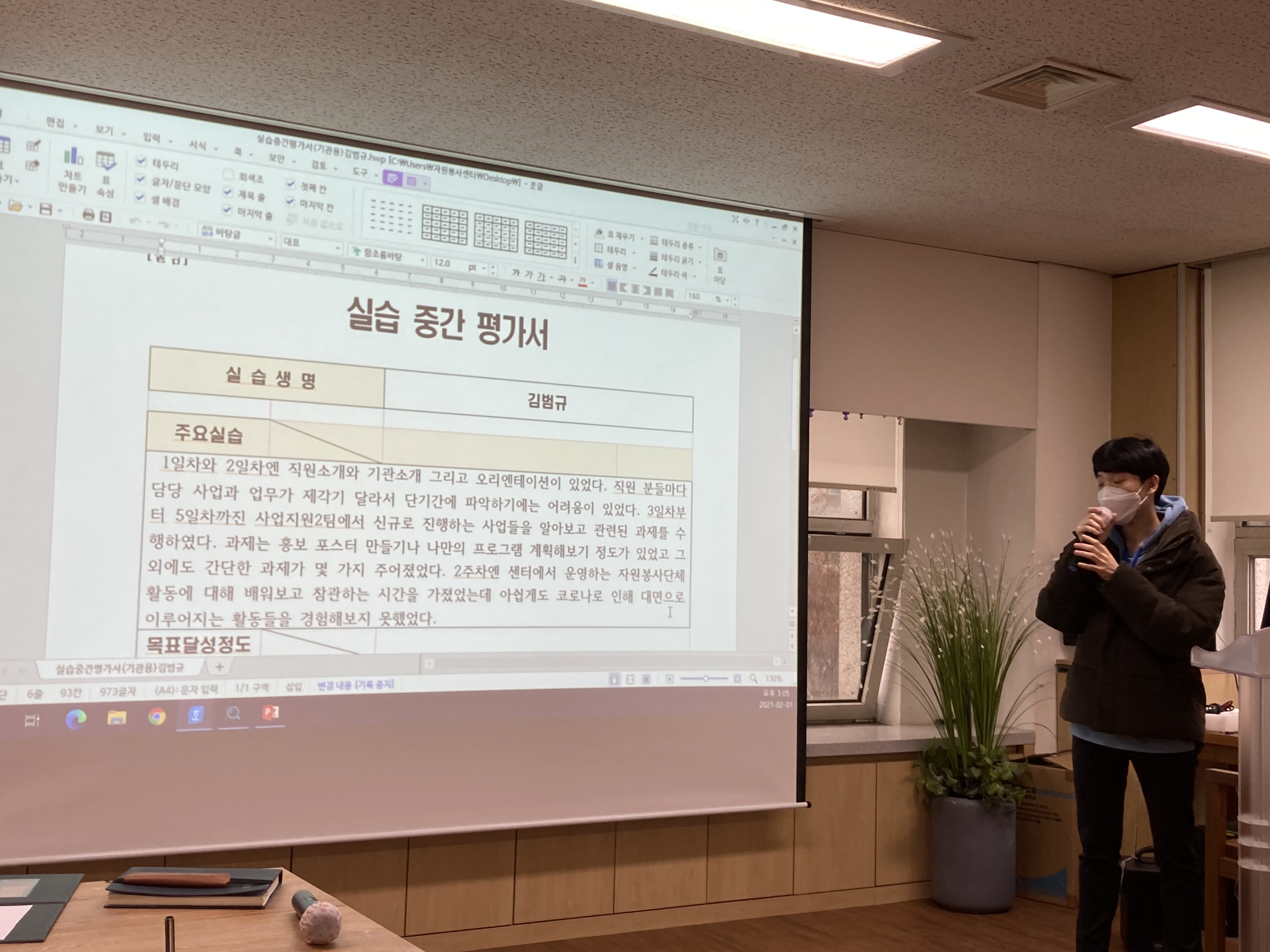 지난 월요일 2021 동계사회복지현장실습 중간평가회가 열렸습니다. 두 명의 예비사회복지사 선생님들께서 2주 동안 진행된 실습 내용과 소감, 목표 등에 대한 발표를 해주었습니다. 남은 2주 동안도 보람있고 알찬 사회복지현장실습이 이뤄지도록 많은 응원과 격려바랍니다.