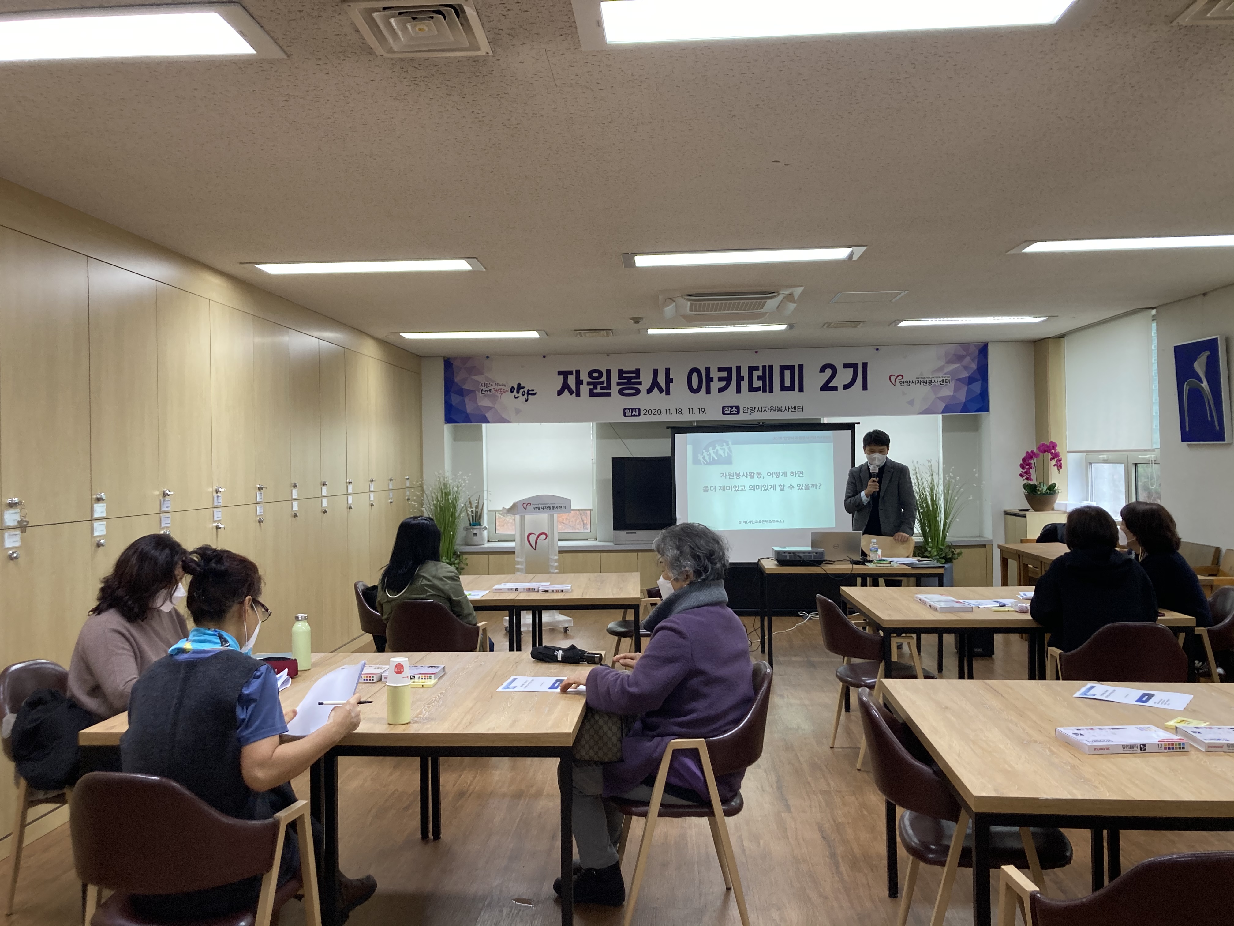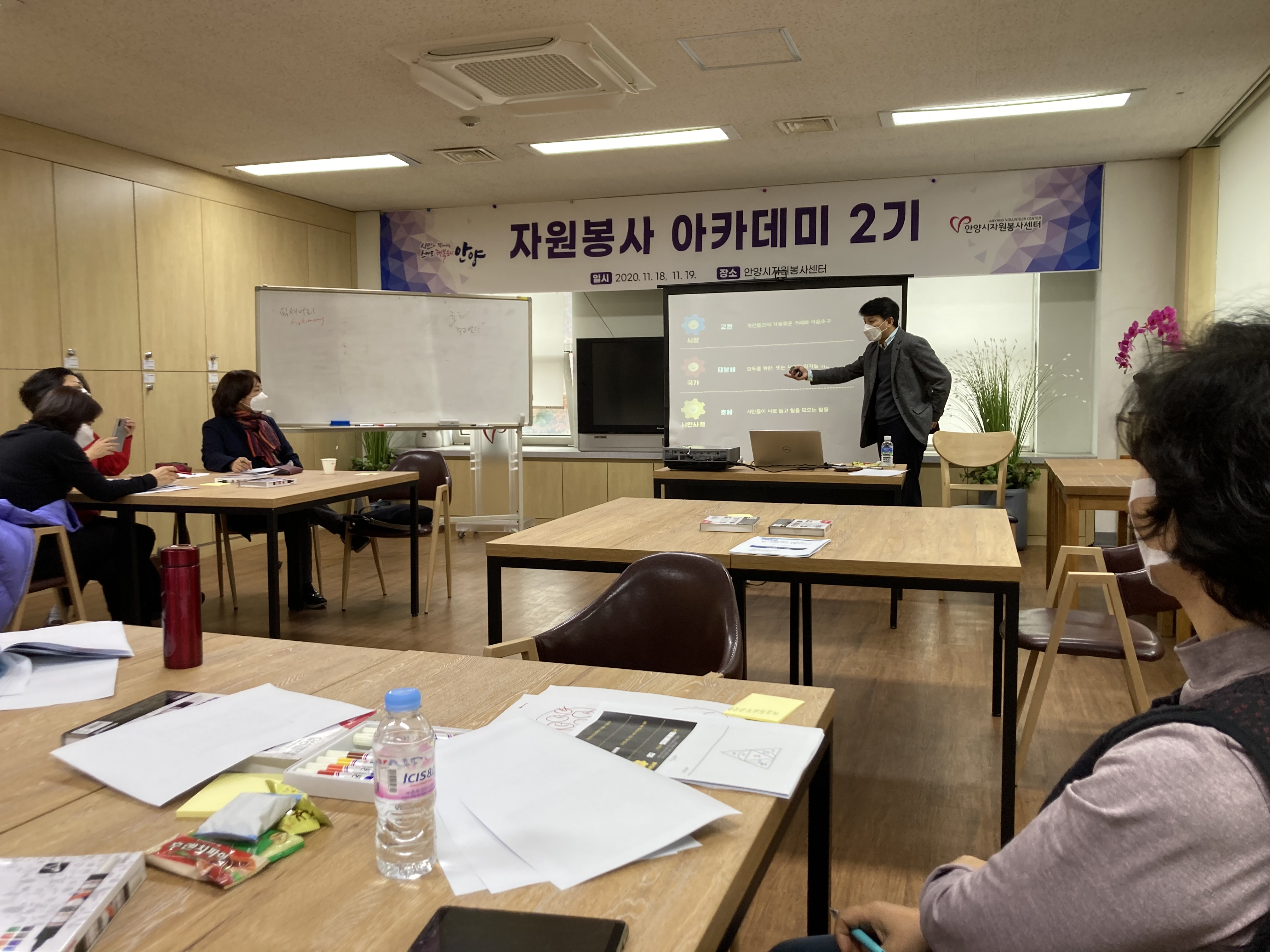 지난달 19, 20일 센터사랑뜰에서 자원봉사아카데미 2기 교육이 진행되었습니다. 자원봉사단체 단체장 및 임원 10여분께서 참석해주셔서 자원봉사활동일감에 대한 전문적인 교육을 받으셨습니다. 강의는 시민교육콘텐츠연구소 정혁 강사님께서 진행해주셨고 대상자를 고려한, 자원봉사자 동기유발을 고려한 일감 기획이라는 주제로 열띈 강의를 진행해주셨습니다. 이번 강의를 통해 안양시자원봉사가 효과적이고 전문성을 더 갖게 되길 기원합니다. *본 교육은 사회적 거리두기1단계에 진행되었으며 발열체크, 손소독, 마스크 착용등 철저한 방역과 함께 이루어졌습니다.