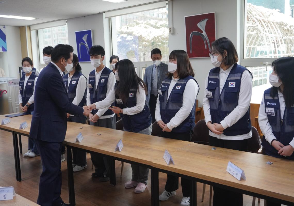 현지 파견 출정식은 개회, 청년봉사단 선서, 시장님 인사말씀, 의장님 격려서, 안양시자원봉사센터 뱃지 수여식, 기념촬영 그리고 k-POP 숏폼 콘텐츠 촬영으로 진행되었습니다.